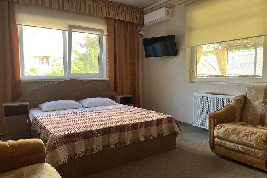 • Просторный зал — двуспальный раскладной диван, две односпальные кровати, ЖК-телевизор