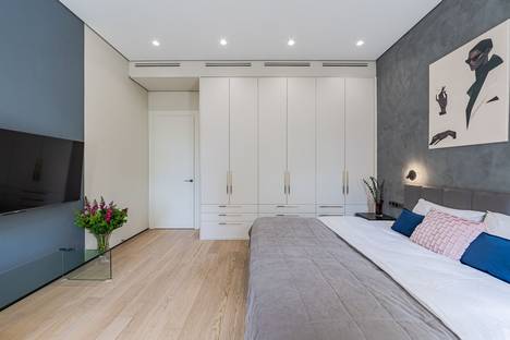 В спальне кровать с ортопедическим матрасом средней жесткости размером 180*200, креслом, многочисленной системой хранения одежды, TV.
