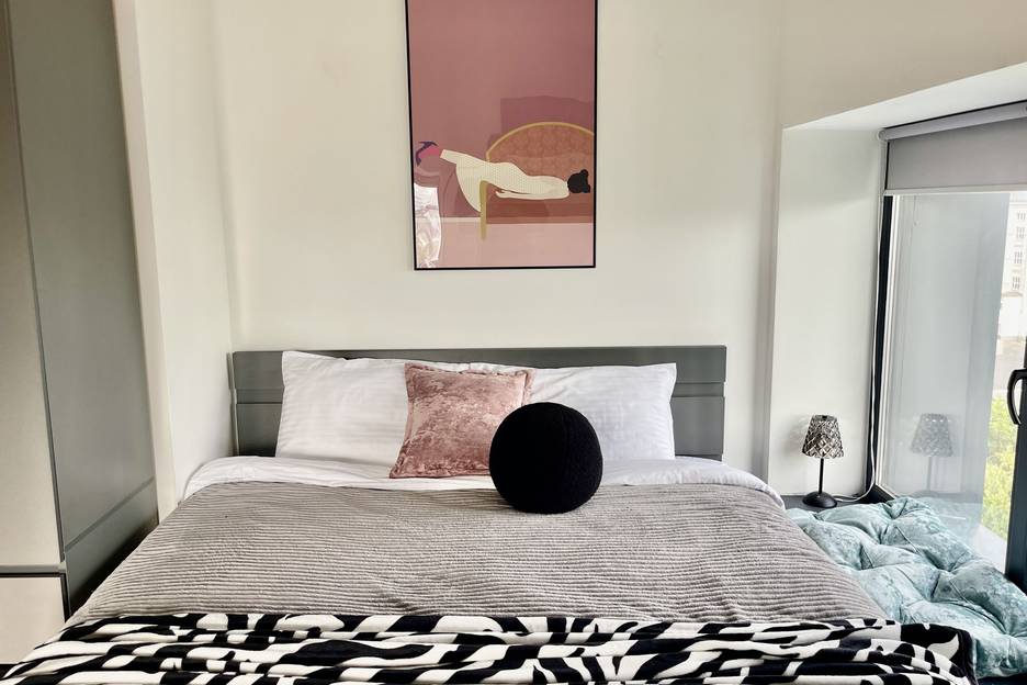 *Широкая двуспальная кровать с чистым белым постельным бельем для крепкого сна.