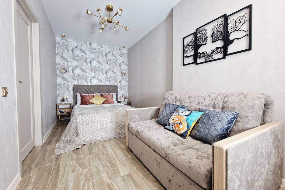 Представляем вашему вниманию комфортабельные двухкомнатные апартаменты площадью 40 м² в современном жилом комплексе. Квартира выполнена в современном стиле с использованием качественных материалов. Эргономичная планировка и продуманное зонирование создают атмосферу домашнего уюта. Количество комнат: 2 (изолированная спальня и просторная гостиная, совмещенная с кухонной зоной). Вместимость: до 6 человек (есть двуспальная кровать и раскладывающийся диван в спальне, а также раскладывающийся диван в гостиной).