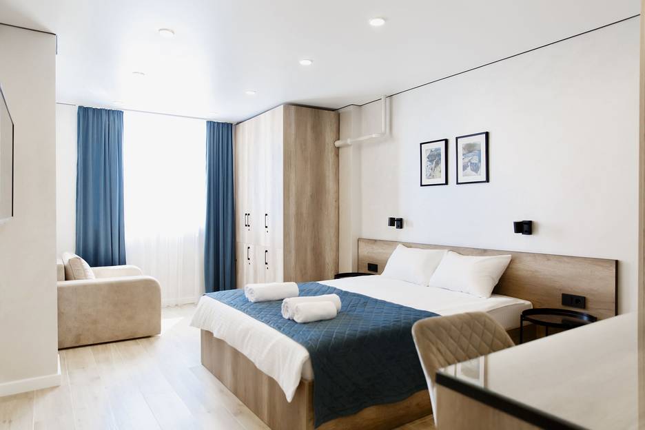 Просторный номер с современным дизайном, мягким освещением и свежим ремонтом создаёт атмосферу спокойствия и отдыха.