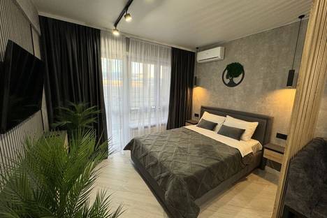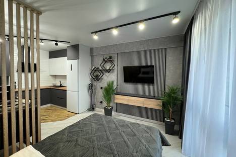 В спальне вас ждёт двуспальная кровать с ортопедическим матрасом и качественным постельным бельём из страйп-сатина. В апартаментах также есть Smart TV, кондиционер, пылесос, фен и утюг. Кроме того, вы найдёте средства гигиены, полотенца и всё необходимое для комфортного проживания. После каждого выезда проводится качественная уборка.