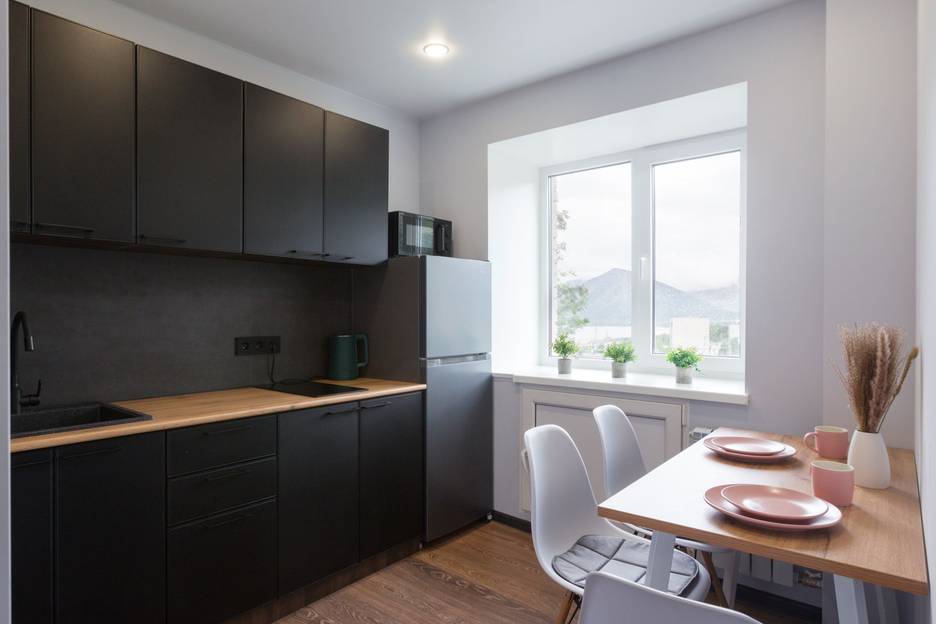 - Полностью оборудованная кухня: варочная панель, микроволновка, чайник, холодильник, посуда для готовки и сервировки