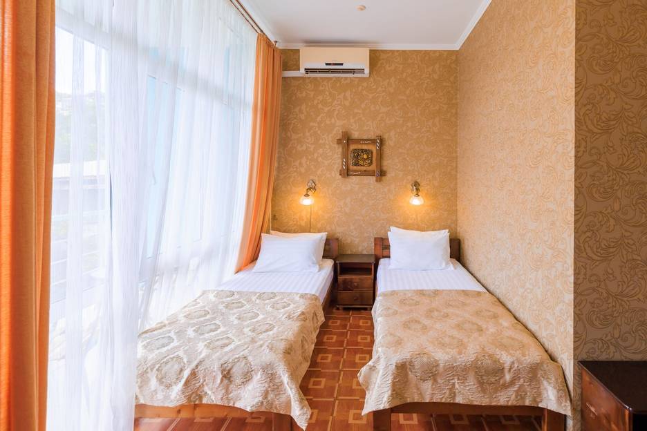 Номера категории Эконом (I-категория) (с двумя односпальными кроватями ) - функциональные и удобные, площадью от 16м/кв., имеют все необходимое для комфортного проживания. В номере имеется двуспальная кровать, шкаф-купе, стол, LCD телевизор (спутниковое телевидение), кондиционер, холодильник. Для вашего удобства в номере находится электрочайник, фен. Санузел оснащен душевой кабиной с постоянной подачей холодной и горячей воды. В каждом номере есть балкон, из которого открывается прекрасный вид на хвойный сквер и Крымские горы.