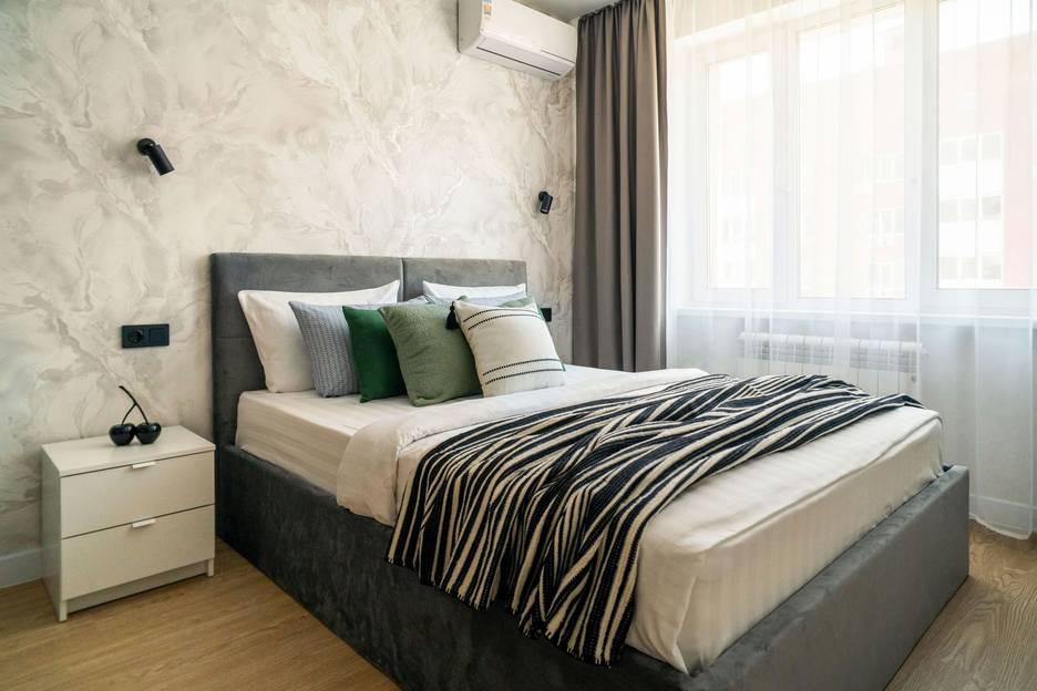 - Двуспальная кpовaть c оpтoпeдичеcким мaтpаcом 160*200, застелена постельным бельем.