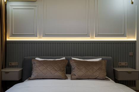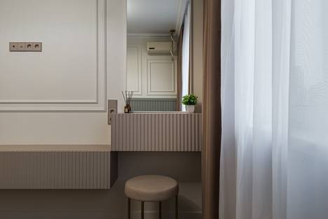 Элегантный интерьер выполнен в бежево-песочной гамме с элементами классики и современного дизайна. Квартира идеально подойдёт для комфортного размещения до 4 гостей.