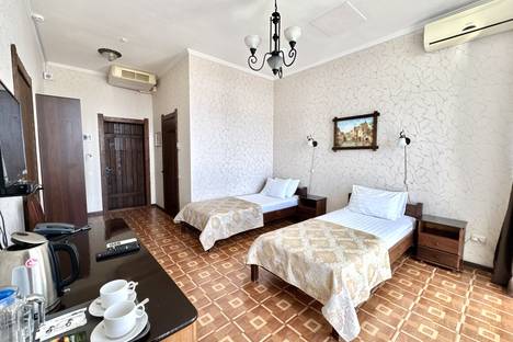 В номере: две односпальные кровати (80 см х 180 см), кондиционер, шкаф для одежды, прикроватные тумбы, стол, стул, чайная посуда, возможность подключения к интернету через