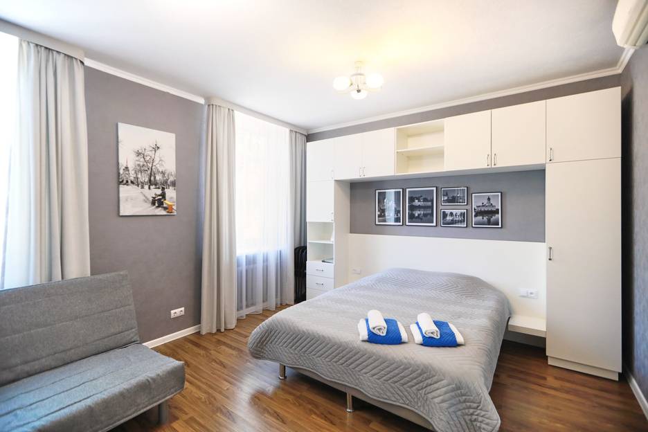 В качестве спального места у нас двуспальная кровать с удобным матрасом и раскладной диван. В студии для Вашего удобства есть кондиционер, фен, стиральная машина, утюг, гладильная доска. Мини кухня вмещает СВЧ, мультиварка, набор посуды, чайник, индукционная плитка и кофеварка.