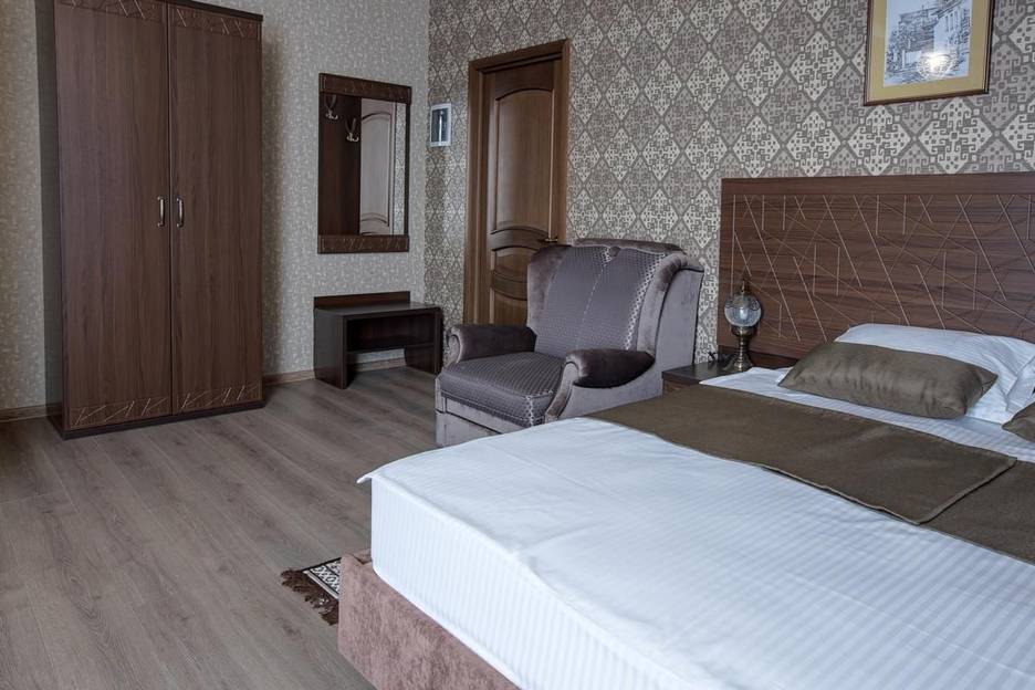 Номер включает в себя большую кровать, письменный стол, отдельную гостиную зону кресло – кровать, а также дополнительные удобства, холодильник, чайник, посуда, кондиционер, телевизор, душевая комната/ WC/, бесплатный Wi-Fi. Кроме того, гостей ожидает комфорт и уютная атмосфера крымско-тарского стиля.
