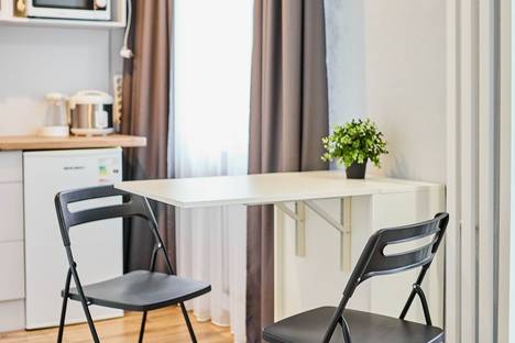 В качестве спального места у нас раскладная кровать 160х200 с удобными матрасами. В студии для Вашего удобства есть кондиционер, фен, утюг, гладильная доска. Мини кухня вмещает СВЧ, мультиварка, набор посуды, чайник, индукционная плитка.