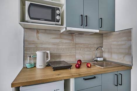 удобная обеденная и кухонная зона с набором посуды, плитой, микроволновой печью
