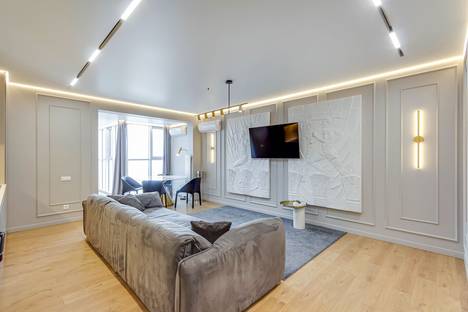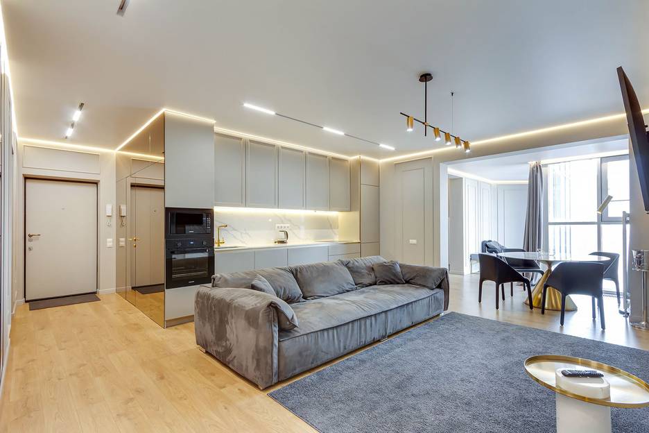 · Стиль и комфорт: Просторная квартира с модным ремонтом, панорамными окнами и видом на город. Четкое зонирование на гостевую зону с удобным диваном и уединенную спальную зону.