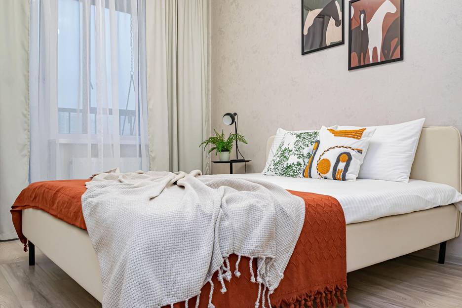 — Двуспальная кровать с ортопедическим матрасом и нежным постельным бельём из сатина