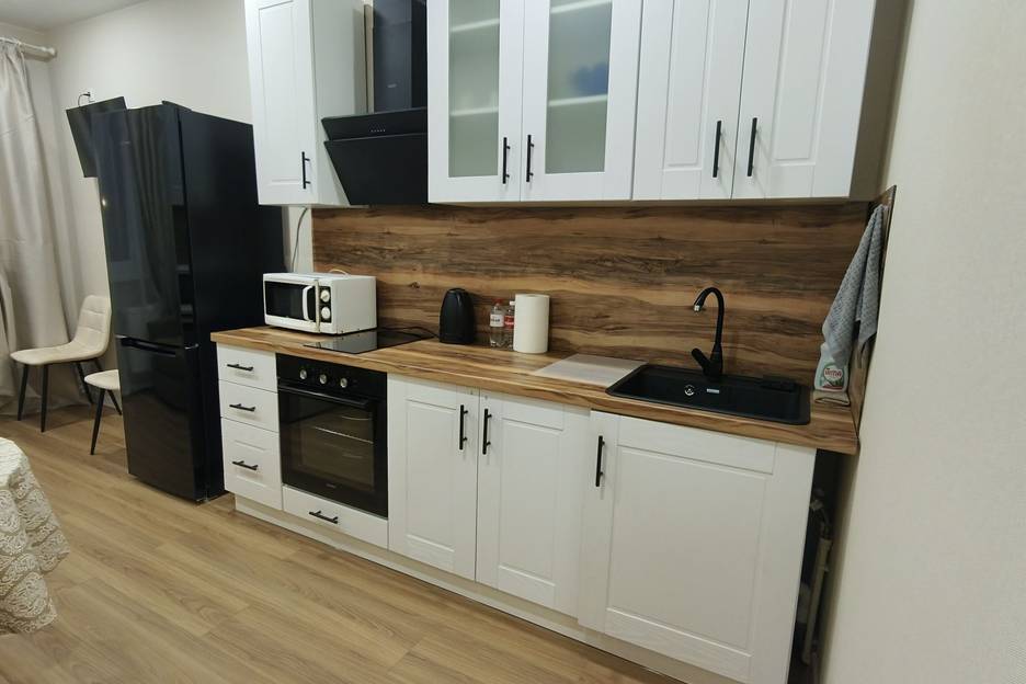 - Полностью обустроенная с холодильником, варочной панелью, духовым шкафом, микроволновкой,чайником,посудой и другими удобствами.