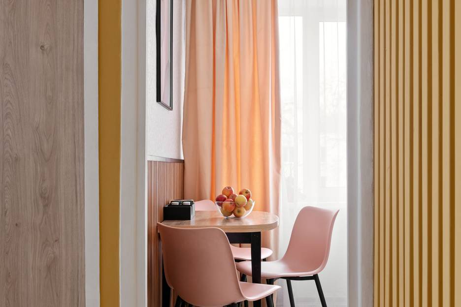 Плита не работала, карниз отваливается и тюль не двигается. Нет чайных ложек. Есть на табуретках за мини столом не очень.