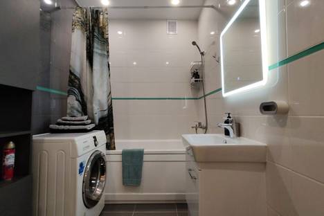Атмосферная ванная комната с подсветкой на зеркале.