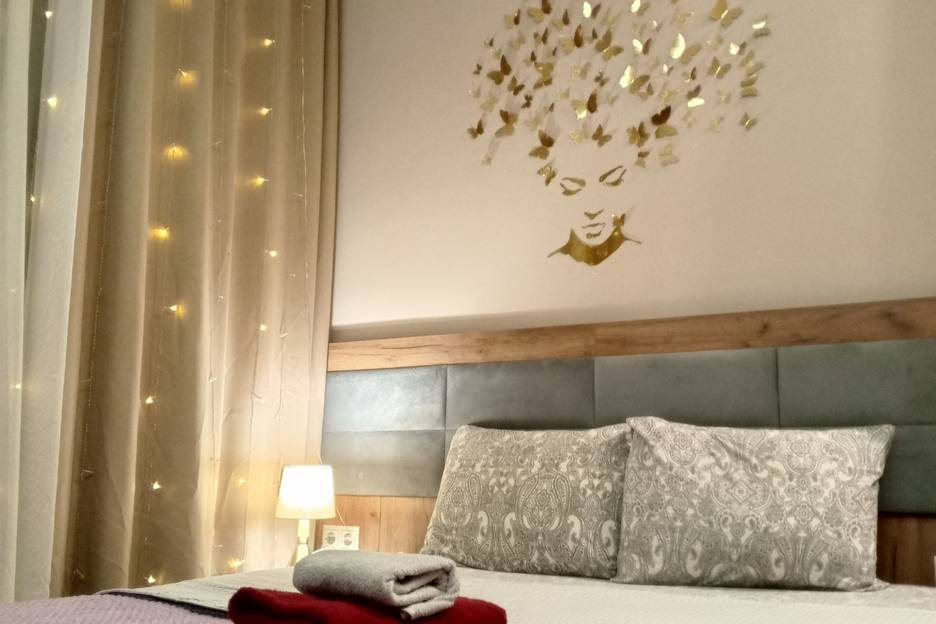 ● двуспальная кровать с ортопедическим матрасом и реечными ламелями;