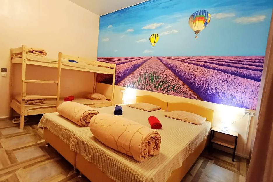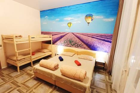 4-х местная семейная комната. Кровати деревянные, надежные, заправлены плотными матрасами и хлопковым постельным бельем. Подушки гречишные, антиаллергенные и с ортопедическим эффектом. Также комната оснащена комодом, гардеробной системой, вешалкой, прикроватными тумбочками. Есть телевизор, холодильник, зеркало. В стоимость входит: комплект постельного белья и полотенце. На территории 3 санузла. Из них: 2 душевые совместно с туалетом и 1 туалет отдельно.Большая кухня-гостиная, полностью оборудованная техникой и посудой для приготовления и приема пищи в любое время. На кухне дополнительно установлен фильтр для питьевой воды. В доступности чай, кофе, какао, сахар, специи, крупы. Вход в квартиру по электронному ключу без ограничений по времени.