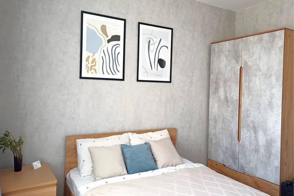 Спальня: двуспальная кровать 200*140 с ортопедическим матрасом, прикроватная тумба, платяной шкаф.