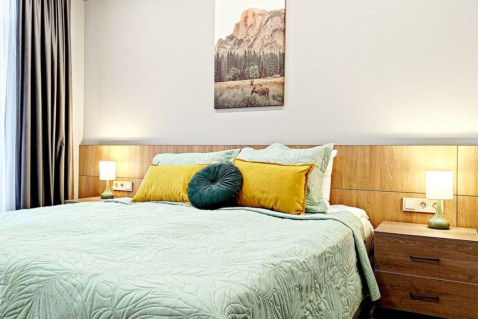 ▌Мягкая большая кровать. Функциональная кухня. Вид на горы.