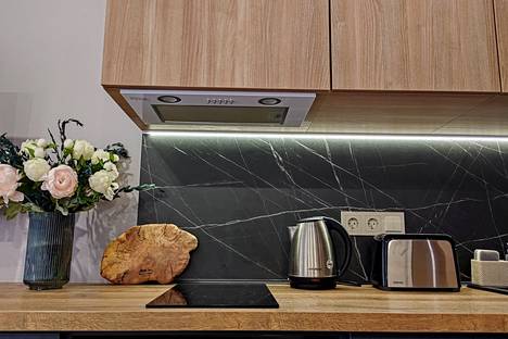 ▌На кухне полная комплектация для приготовления еды. Плита индукционная, микроволновая печь, электрический чайник, тостер, гейзерная кофеварка, холодильник, современная красивая посуда, бокалы, кружки, приборы и другая кухонная утварь