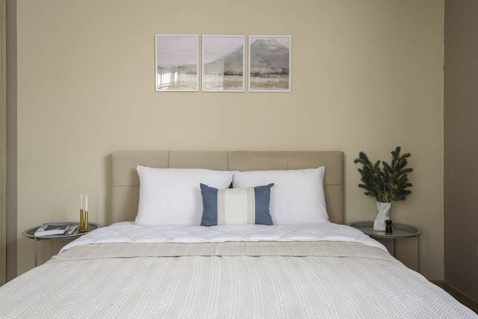 Удобную двуспальную кровать с ортопедическим матрасом, раскладной диван для двух дополнительных мест и одноместный диван.