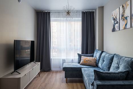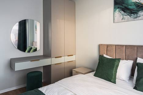 В апартаментах есть отдельная спальня с двуспальной кроватью и удобной системой хранения. В гостиной расположен большой угловой раскладной диван, который может служить дополнительным спальным местом. Пространство светлое, с большими окнами и приятной современной отделкой.