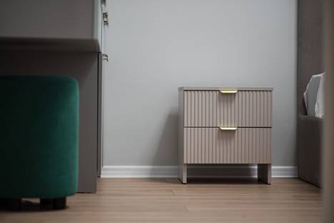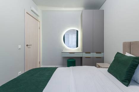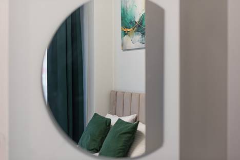 Интерьер апартаментов оформлен в светлых и спокойных тонах с элементами современного стиля и классики. В пространстве есть картины, зеркала с подсветкой и шторы блэкаут — всё для уюта и приватности.