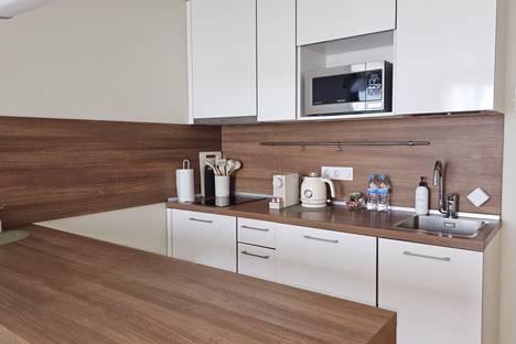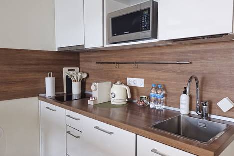 Кухня: полноценная зона с обеденным столом, холодильником, микроволновой печью, посудой и кофемашиной. Чай и кофе — комплимент.