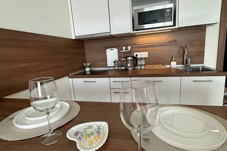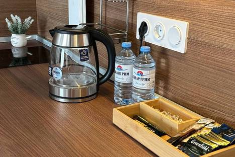 Кухня: полноценная зона с обеденным столом, холодильником, микроволновой печью, посудой и кофемашиной. Чай и кофе — комплимент.