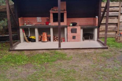 Дом с русской баней.В сосновом бору.На территории зона барбекю с чугунной посудой(казан,садж), качели, крытая парковка для машины,большая терраса для отдыха.Из спальных мест-угловой раздвижной диван.