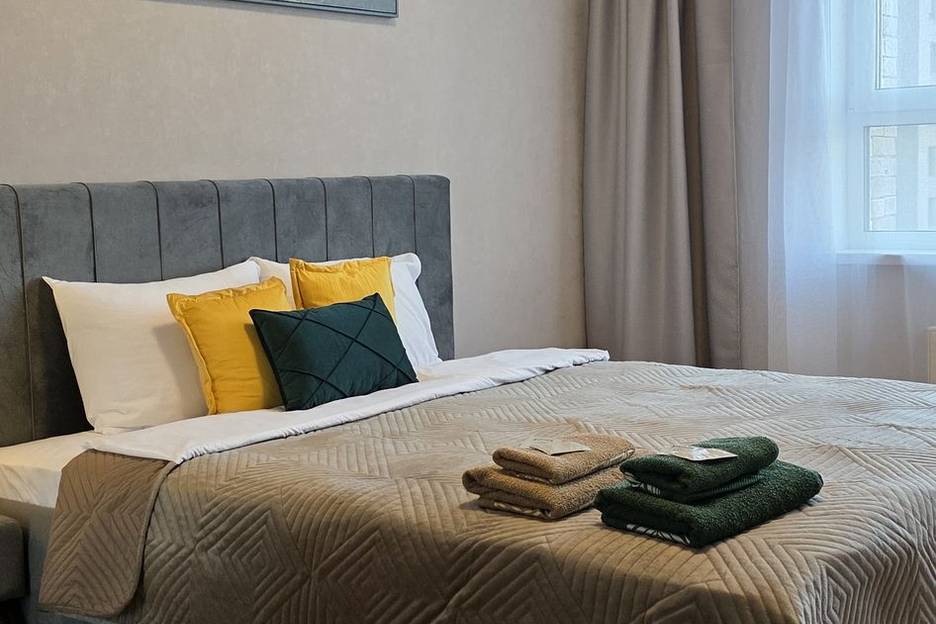В квартире имеется отдельная спальня с широкой кроватью 180 см и ортопедическим матрасом, ЖК телевизор. В гостиной двухспальный диван, огромный ЖК телевизор со смарт тв, умная колонка Алиса, кондиционер. Обеденная зона. Кухонный гарнитур со всей бытовой техникой, включая посудомоечную машину. Так же имеется всё необходимое для отдыха и работы: безлимитный интернет, Wi-Fi, холодильник, стиральная машина, электрический чайник, СВЧ, фен, утюг, гладильная доска, посуда.