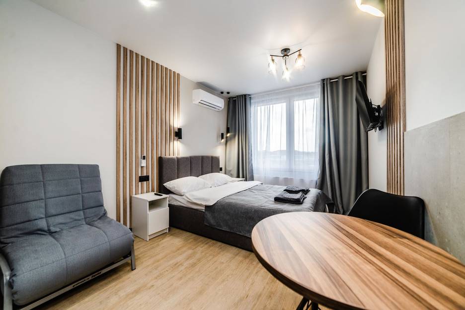 Функциональная студия с дизайнерским ремонтом. Здесь есть всё для комфортного отдыха и продуктивной работы. Вместимость квартиры: от 1 до 3 человек