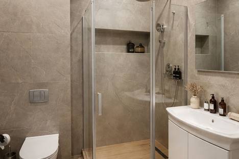 Ванная комната: собственный санузел, тапочки, туалетно-косметические принадлежности, душ, биде, фен, стиральная машина
