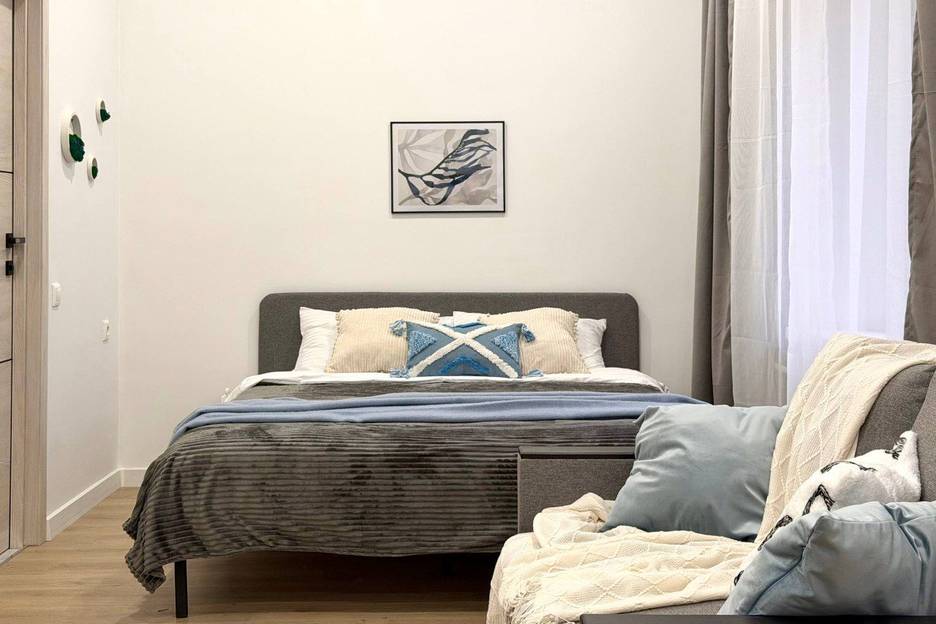 - Двуспальная кровать зaстeлена пocтельным бельем и двуспальный диван