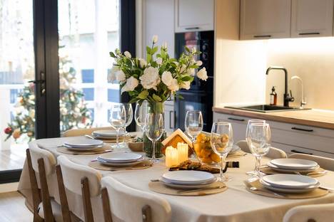 - Полноценный кухонный гарнитур с посудой, рассчитанной на 14 персон, а также необходимая техника - индукционная плита, холодильник, микроволновая печь, духовой шкаф, посудомоечная машина, фильтр для питьевой воды, чайник, тостер.