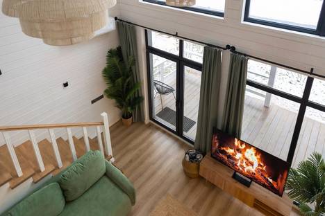 - Гостиная совмещена с кухней. В зоне второго света потолки достигают 7,5 м, что дает хорошую акустику и идеально подходит для ретритов, всевозможных практик от йоги до поющих чаш. Женские круги, девичники/мальчишники, дни рождения - мы рады спокойным не шумным компаниям, которые привыкли отдыхать культурно.