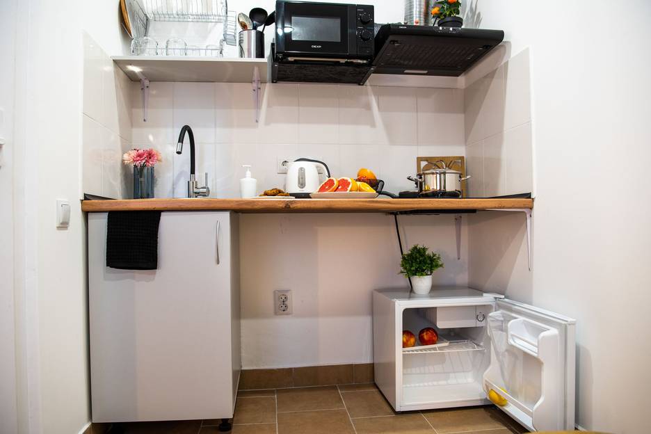 — Удобная двуспальная кровать( две одинарных соединены). — Мини-кухня с бытовой техникой — Холодильник, чайник, микроволновка — Варочная панель, посуда — Стол для приёма пищи — Телевизор, Wi-Fi — Санузел с душевой кабиной — Фен, полотенца, гигиенические принадлежности