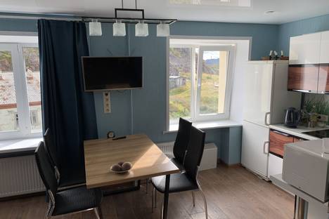Сдаю уютную однокомнатную квартиру-студию от собственника посуточно в Териберке. Площадь 32 кв.м. Вид на горы и море. 4 этаж 5-этажного дома. Количество гостей до 6 чел. Новый современный ремонт и обстановка. Внутри есть все для комфортного проживания и отдыха: двуспальный диван-кровать, 2 двухъярусных кровати, одеяла, подушки, постельное белье и полотенце, телевизор, бесплатный Wi-Fi 150 Мбит/с, обеденный стол и стулья, шкаф для одежды, комод, холодильник, электрический чайник, утюг, микроволновая печь, варочная панель, кухонные принадлежности и посуда. В санузле имеется душевая кабина, фен, стиральная машина, бойлер для горячей воды на 100л. В доме находится Сбербанк, аптечный пункт и почта. Продовольственные магазины, автобусная остановка и море находятся рядом с домом в пешей доступности. У дома имеются места для парковки автомобиля.