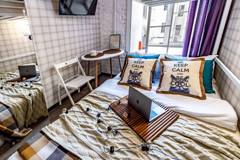 Уютная стильная студия с отличным местоположением. Из минусов — с открытым окном в октябре прохладновато, интернет периодически прерывался на пару секунд.