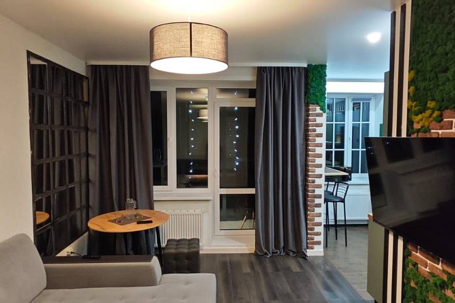 Современная квартира с дизайнерским ремонтом, с изолированной спальней и кухней - гостиной и видом, открывающимся с просторной лоджии с панорамным остеклением.