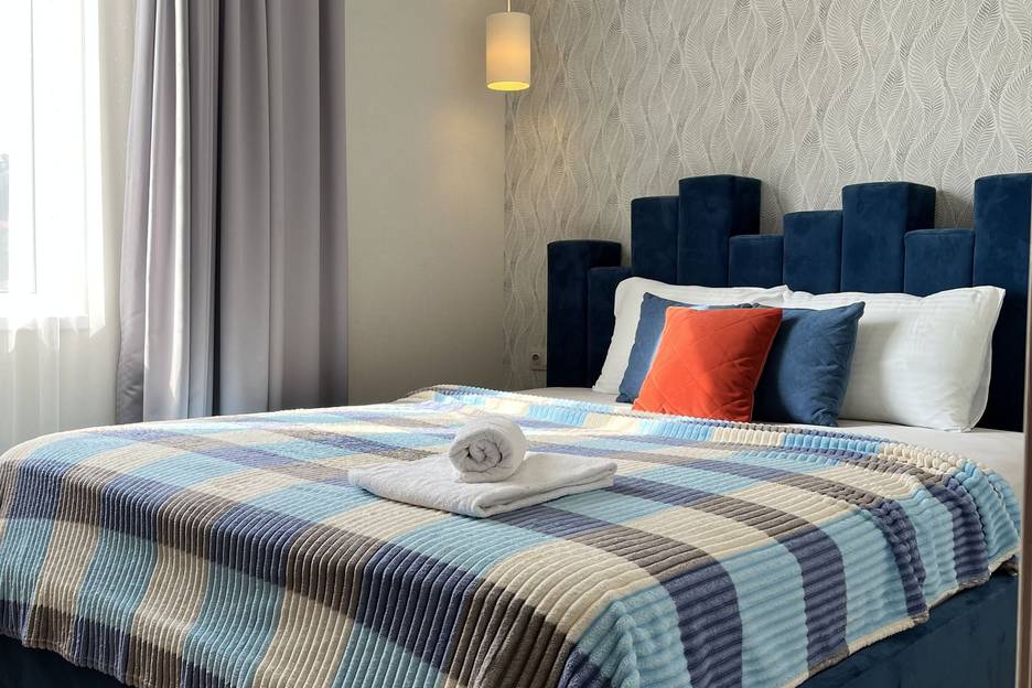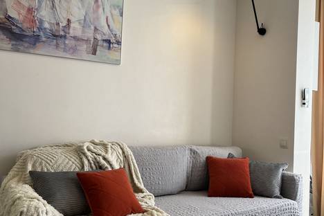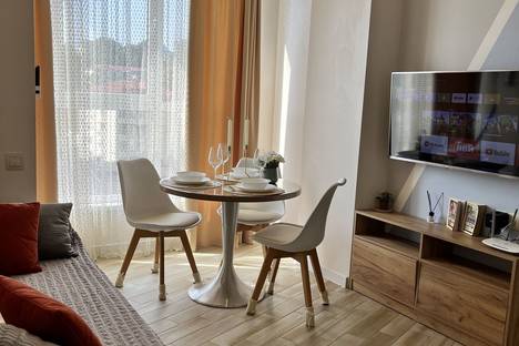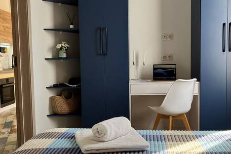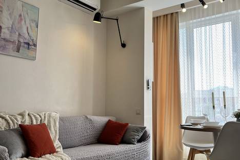 В квартире с дизайнерским интерьером есть отдельная спальня и комната-студия. В квартире есть всё необходимое: от кухонной утвари до посудомоечной машины. В спальне установлена кровать размером 180х200 см с ортопедическим матрасом. Комната-студия оборудована раскладным диваном и телевизором. Апартаменты расположены в доме с закрытым двором.