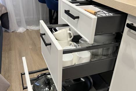 -полностью оборудованная кухня (плита, холодильник, СВЧ печь, чайник, вся необходимая посуда,