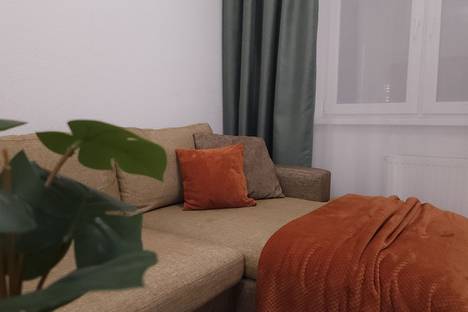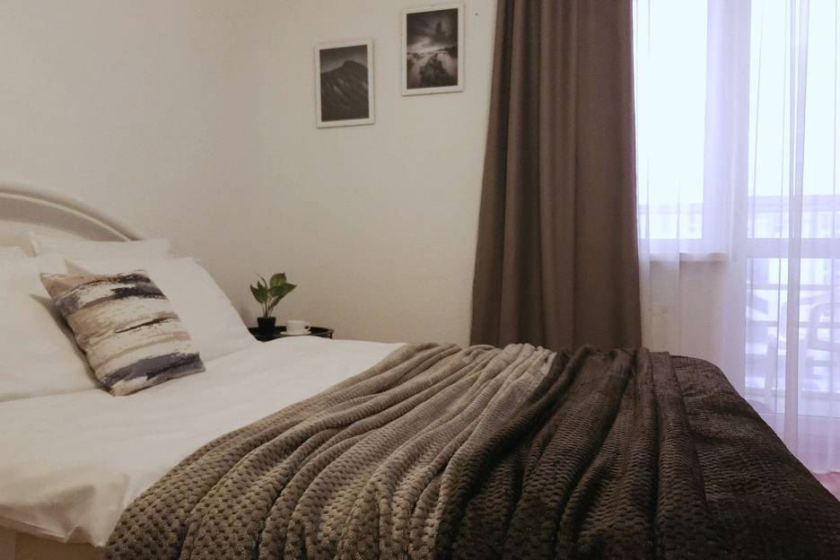 Большая гостевая комната с кухонной зоной. Отдельная спальная комната с выходом на лоджию. В гостевой комнате большой угловой диван 220*200, обеденный стул со стульями, телевизор smartTV, в спальне двуспальная кровать и плательный шкаф. Предоставляем постельное белье на каждое спальное место, полотенца из расчета на 4 человека. В доме 2 лифта (грузовой, пассажирский). Во дворе большая детская площадка.