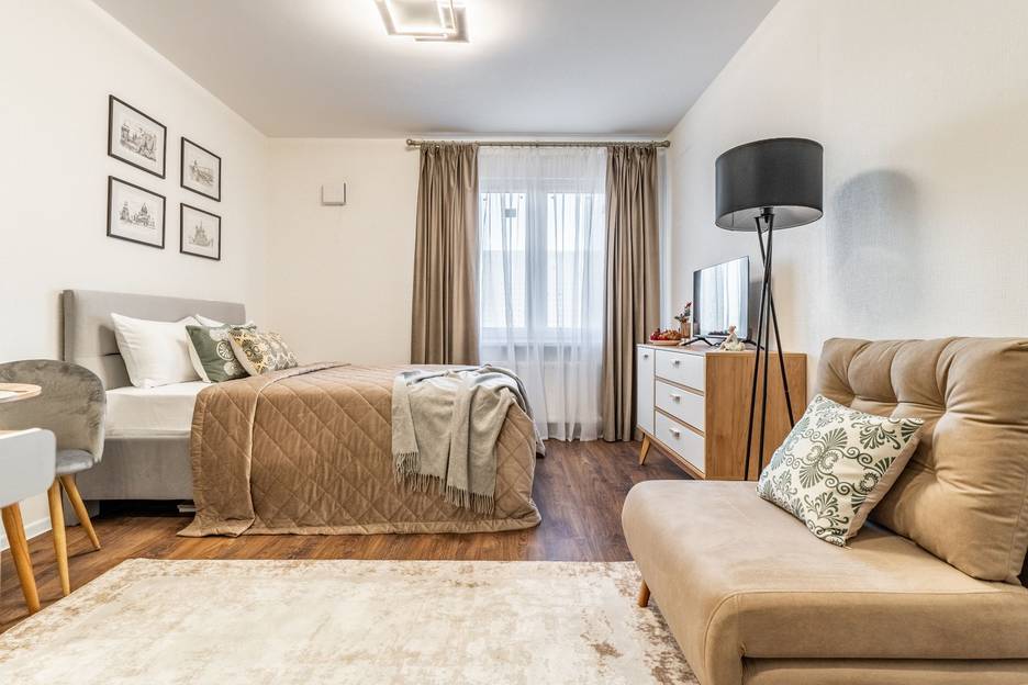 Этa прeкpacная студия обладает всеми необходимыми удобствами, чтобы сделать ваше пpeбываниe максимально комфортным и приятным. Просторная и светлая комната позволит вам расслабиться после насыщенного дня и насладиться уютной атмосферой. Отличная меблировка и современный дизайн создадут приятное впечатление и добавят шарма вашему проживанию. А шторы блэкаут позволят выспаться в любое время суток и года.