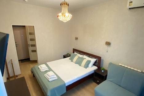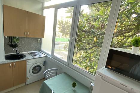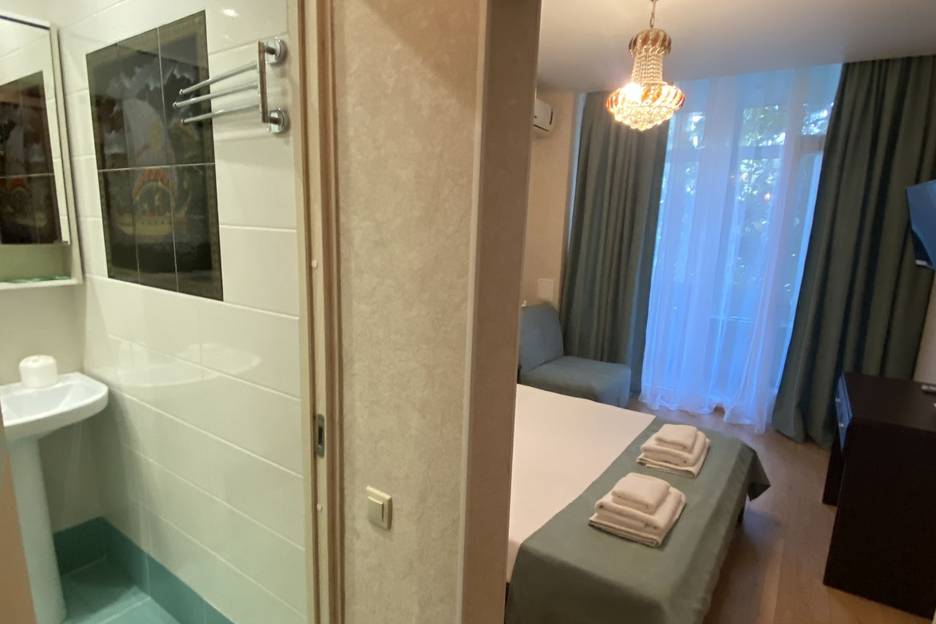 Апартаменты с видом на магнолии в мятных тонах. Вместимость до 3 гостей. Вариации кроватей: Двуспальная кровать (160см/200см) и кресло-кровать (188см/80см). Комплектация: санузел, кровать, кресло-кровать, тумбы, шкаф, столы, стулья, кухонный гарнитур, микроволновая печь, стиральная машина, электрочайник, электрическая плита, посуда, холодильник, телевизор, фен, утюг, WI-FI роутер, светильники, постельное белье, полотенца, туалетные принадлежности.