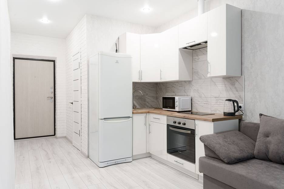 Техника: wi-fi router, микроволновая печь, электрочайник, электроплита, духовой шкаф, холодильник, стиральная машина, телевизор со smart TV, гладильная доска, утюг, пылесос, фен для волос.