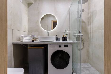 Ванная комната: душевая кабина, набор банных принадлежностей, мягкие полотенца, фен, стиральная машина