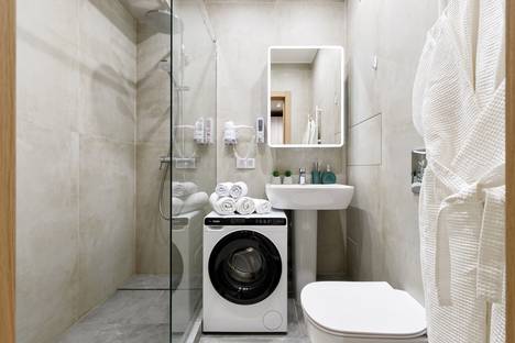 Ванная комната: Душевая кабина, набор косметики (гель, шампунь, мыло), фен, стиральная машина.