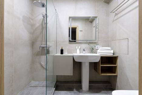 Ванная: Просторная душевая кабина, стиральная машина, банные принадлежности, мягкие полотенца.